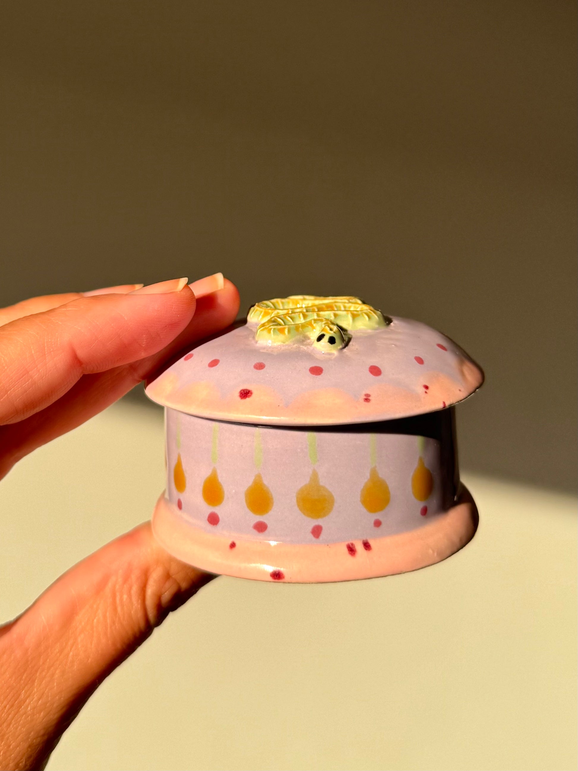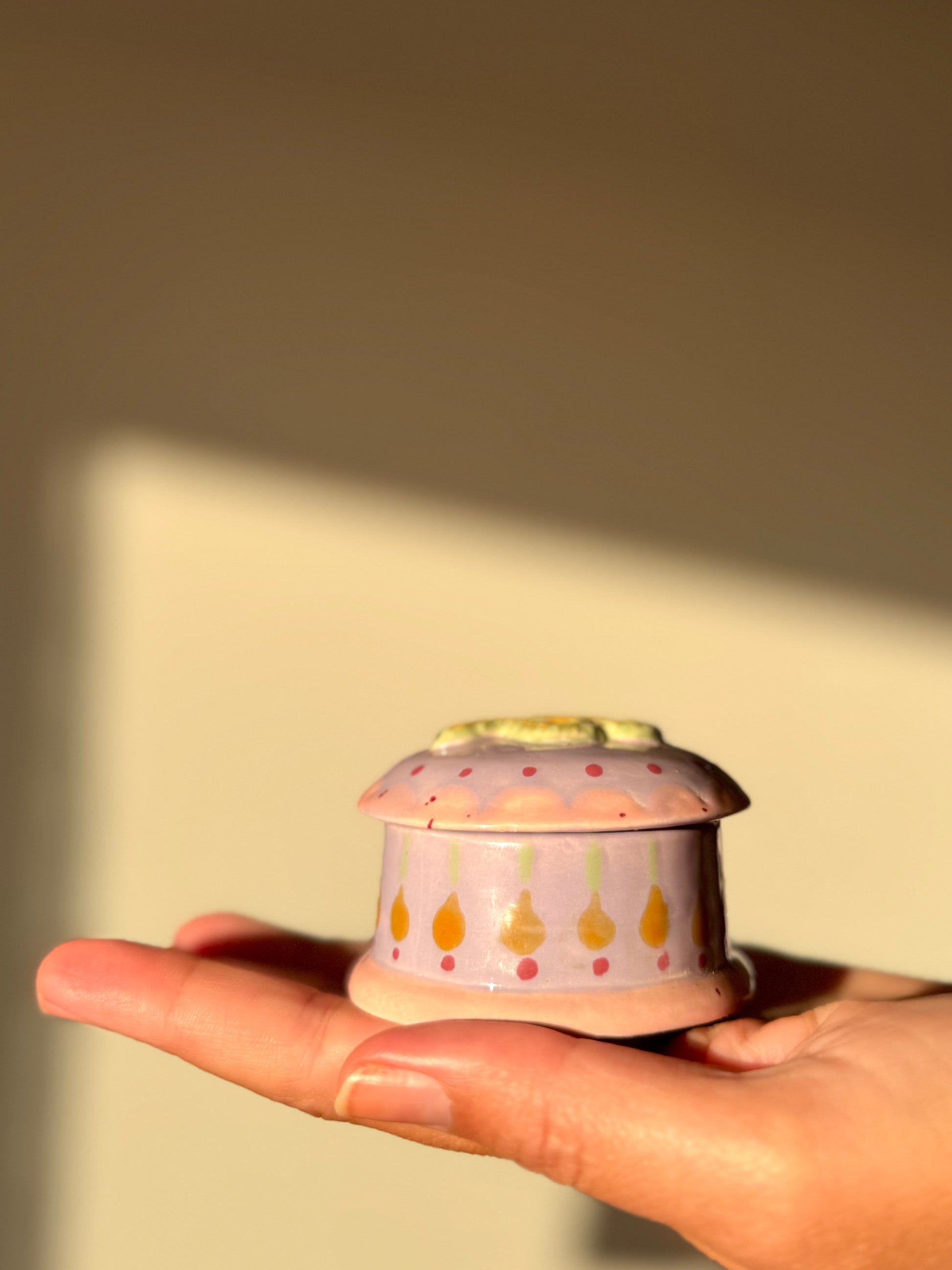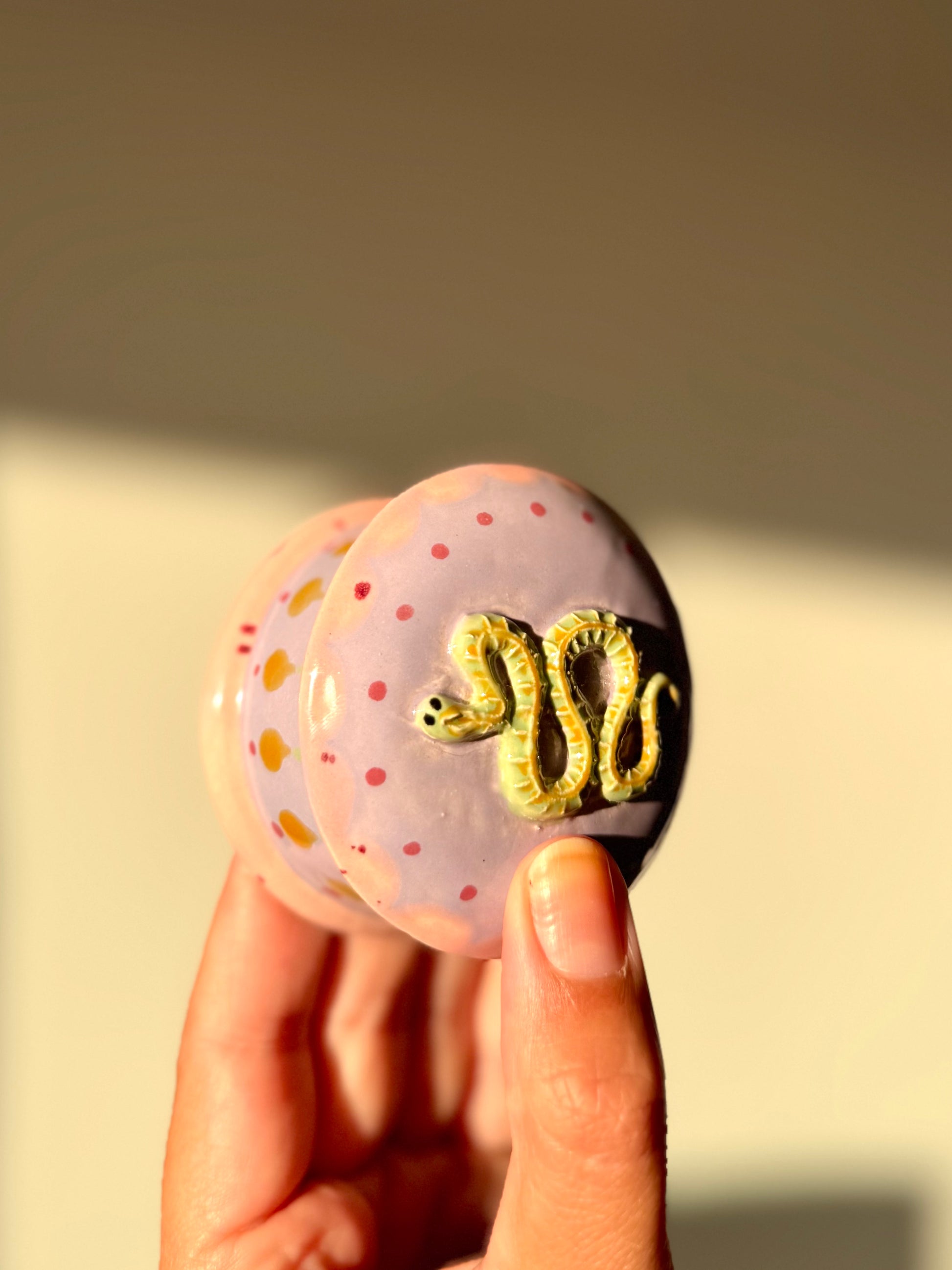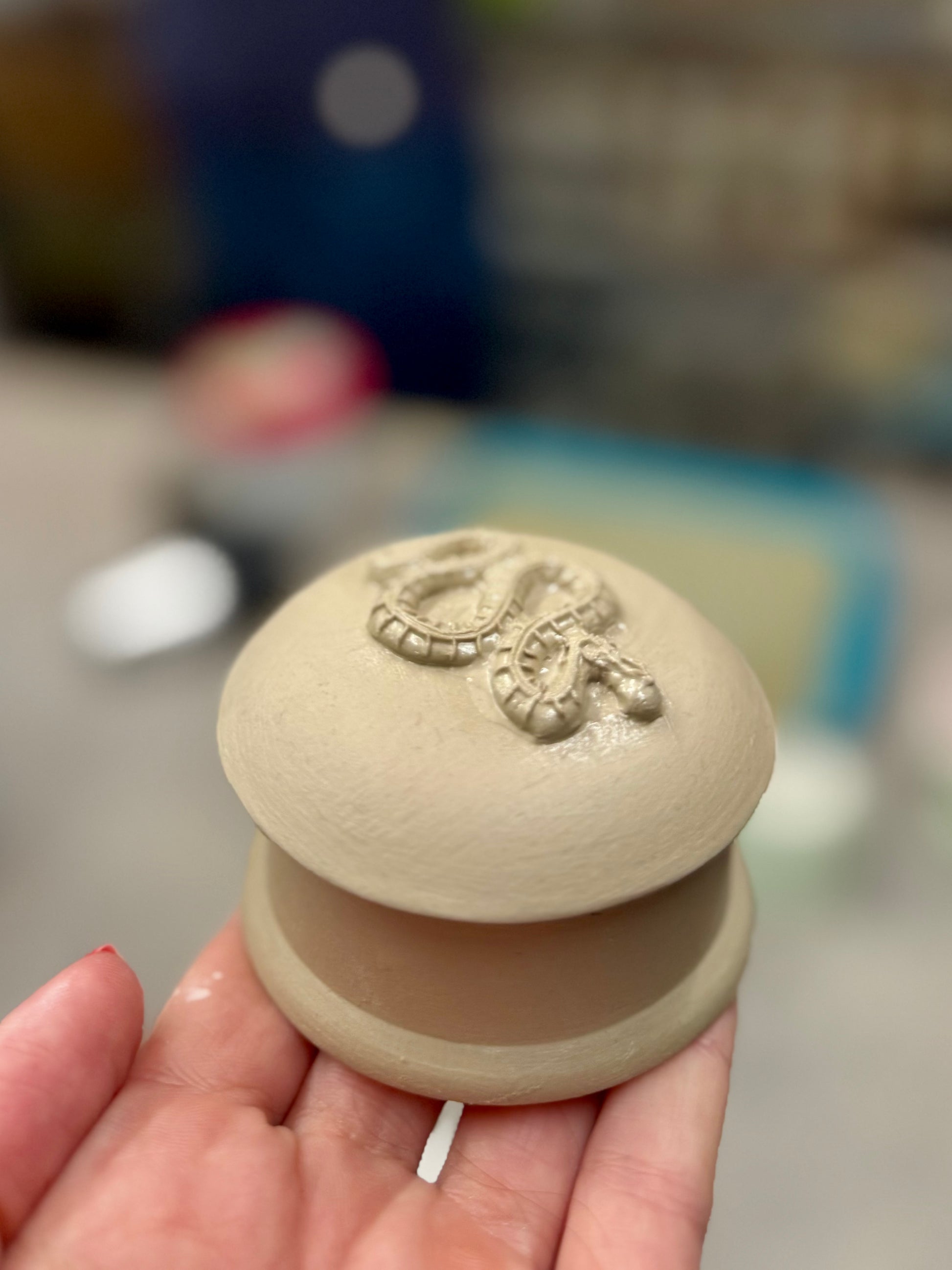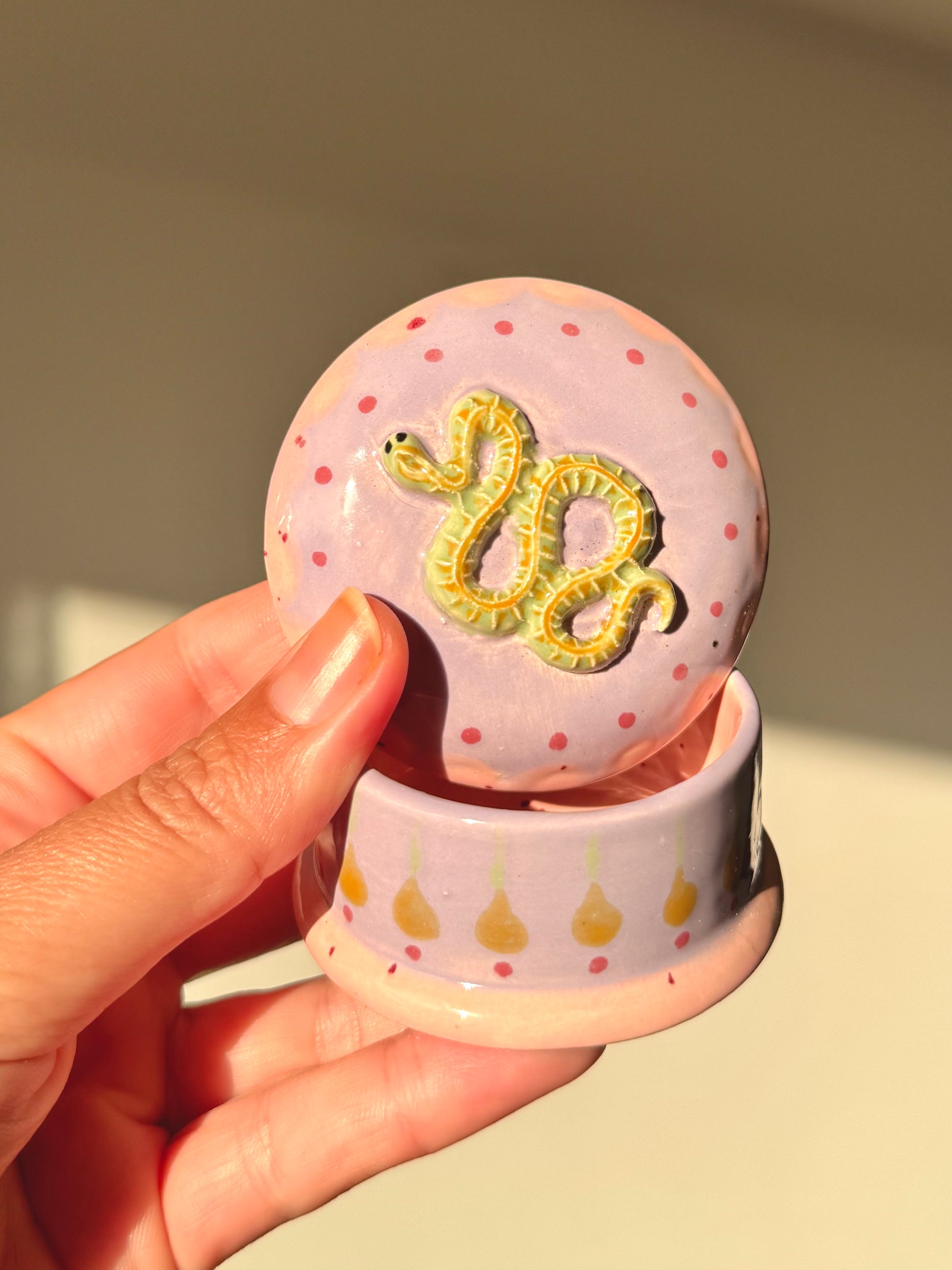 Een klein bewaarpotje met een groot hart. Dit handgemaakte keramieken potje is rijk aan detail, van het gevormde slangetje tot de stipjes en patronen. Ik heb er met veel liefde en geduld aan gewerkt, millimeter voor millimeter. Ideaal om een dierbaar moment of kleinood in te bewaren – van een ring tot een melktandje of gewoon een bijzonder geheim.