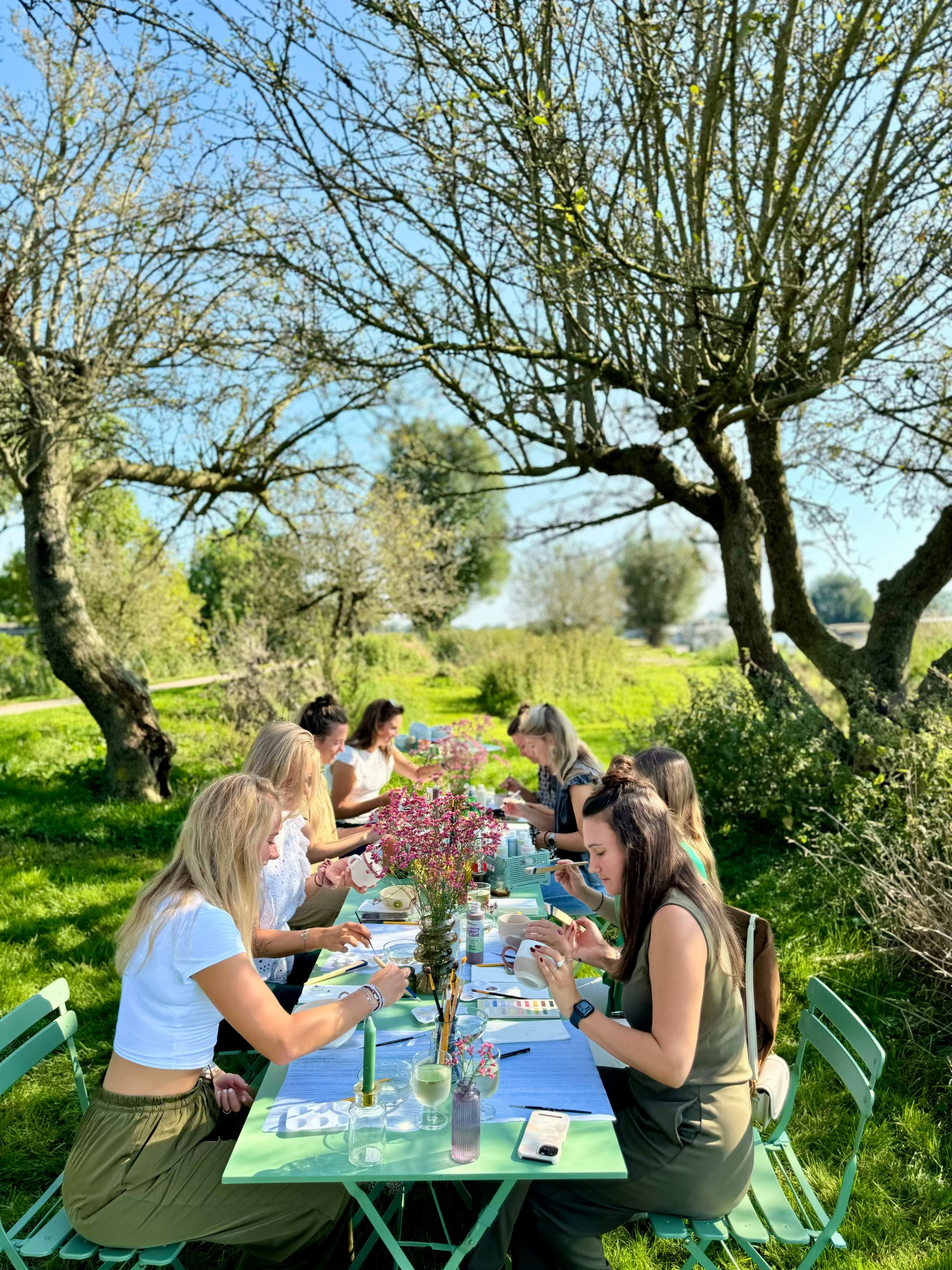 Bij mooi weer werken we buiten tussen de bomen, en bij minder weer heerlijk beschut in de kas van Op het Eiland. Een ontspannen en inspirerende setting met persoonlijke begeleiding met de lekkerste hapjes en drankjes van Op 't Eiland.