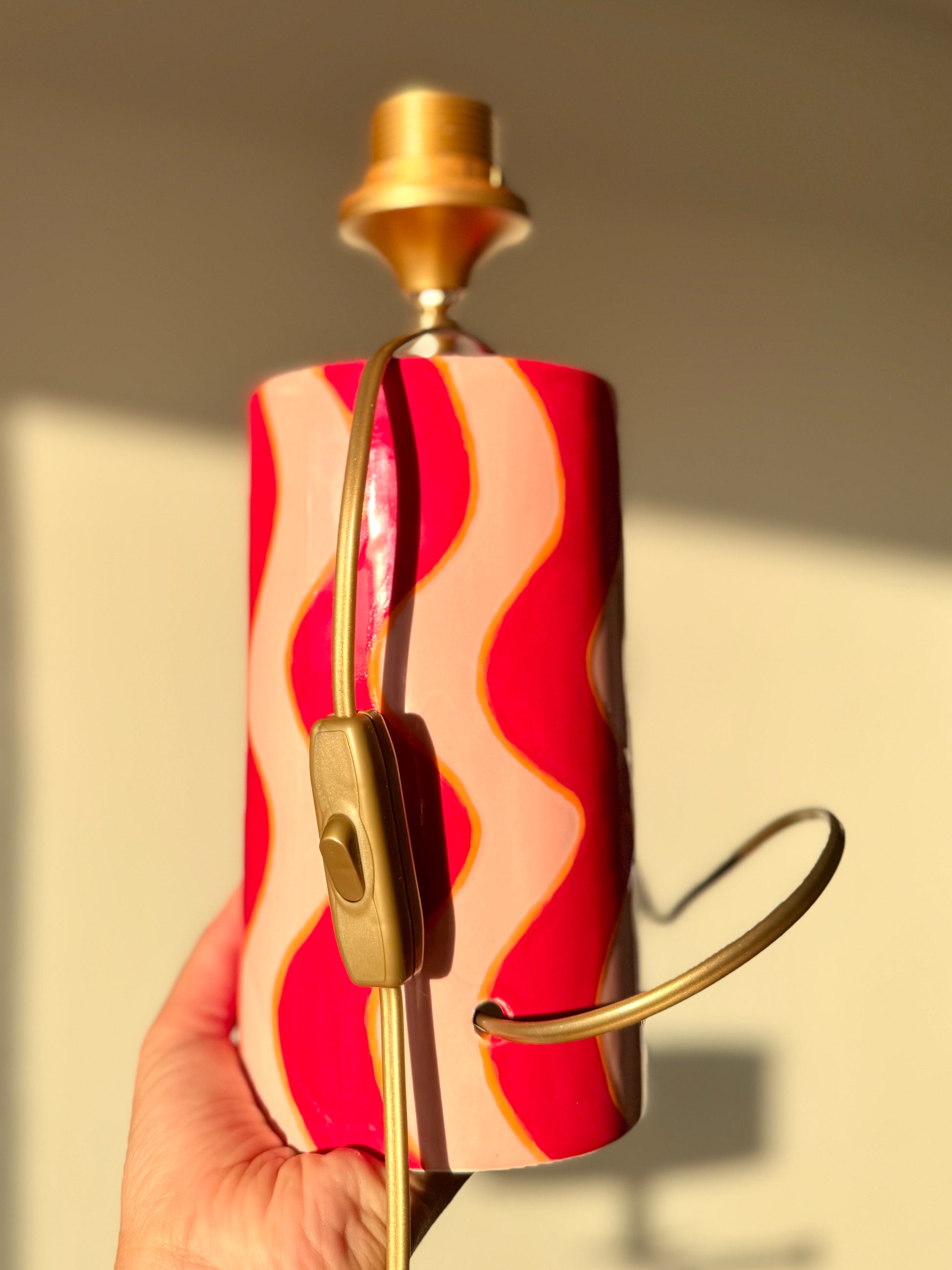 Deze handgemaakte lampenvoet heeft een vrolijk trill-effect in zonnige roze- en roodtinten, met een subtiel oranje detail dat een extra dimensie geeft. Het patroon lijkt bijna te bewegen, waardoor de lamp een echte eyecatcher wordt in je interieur.