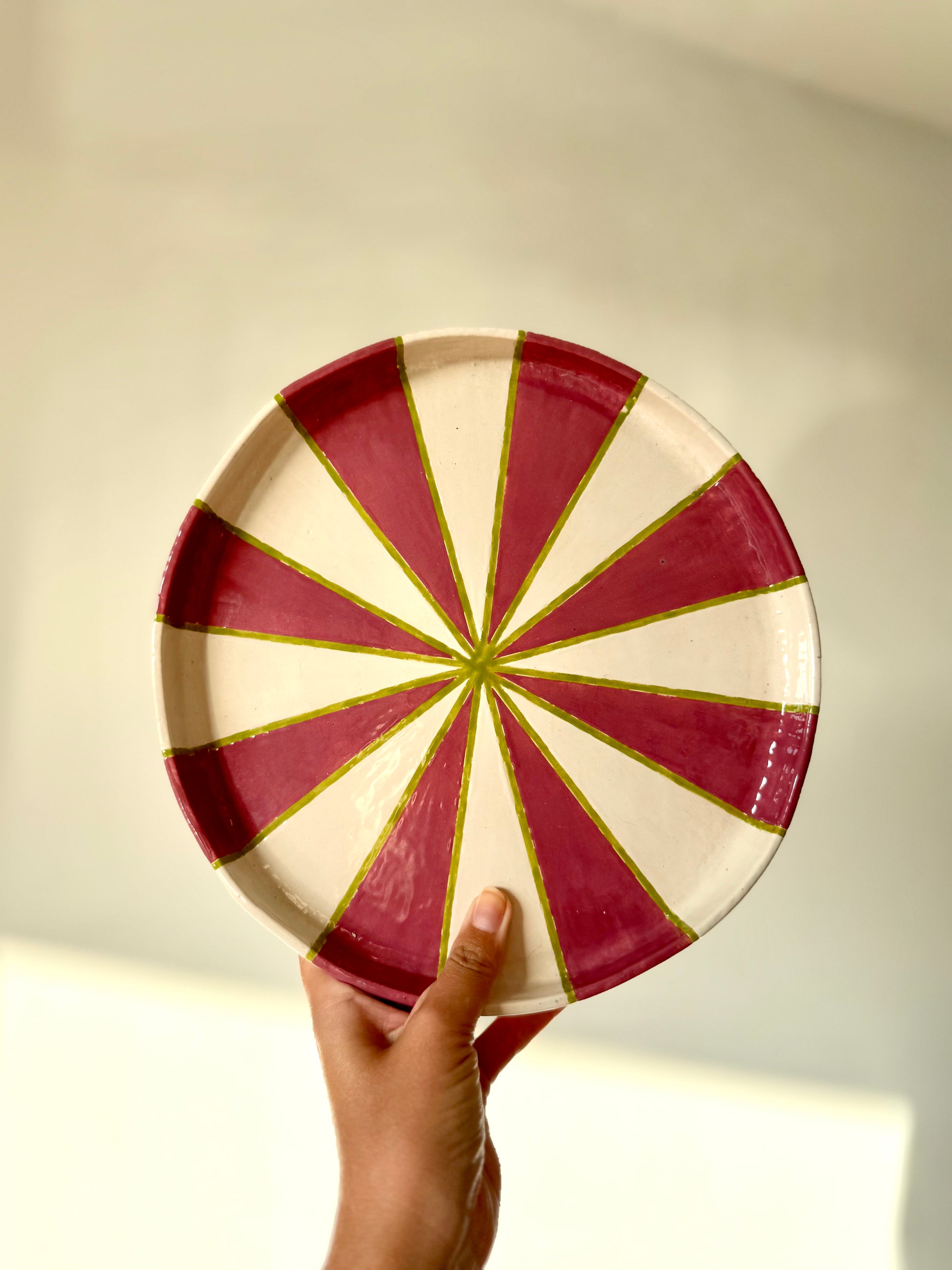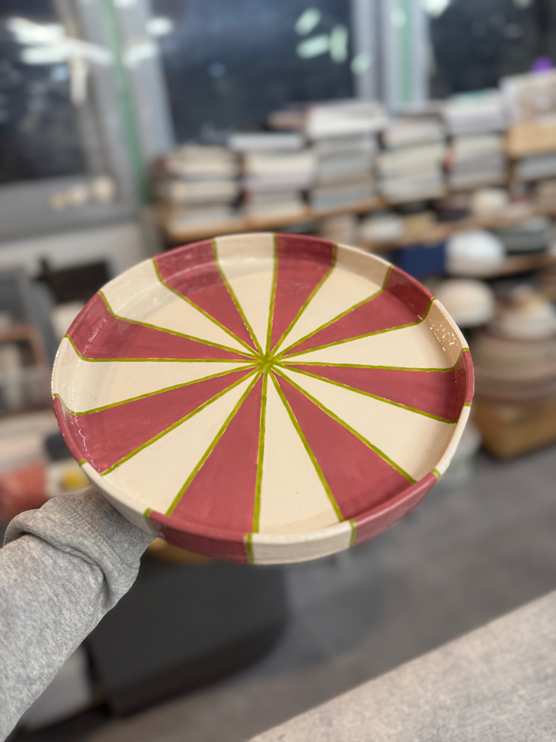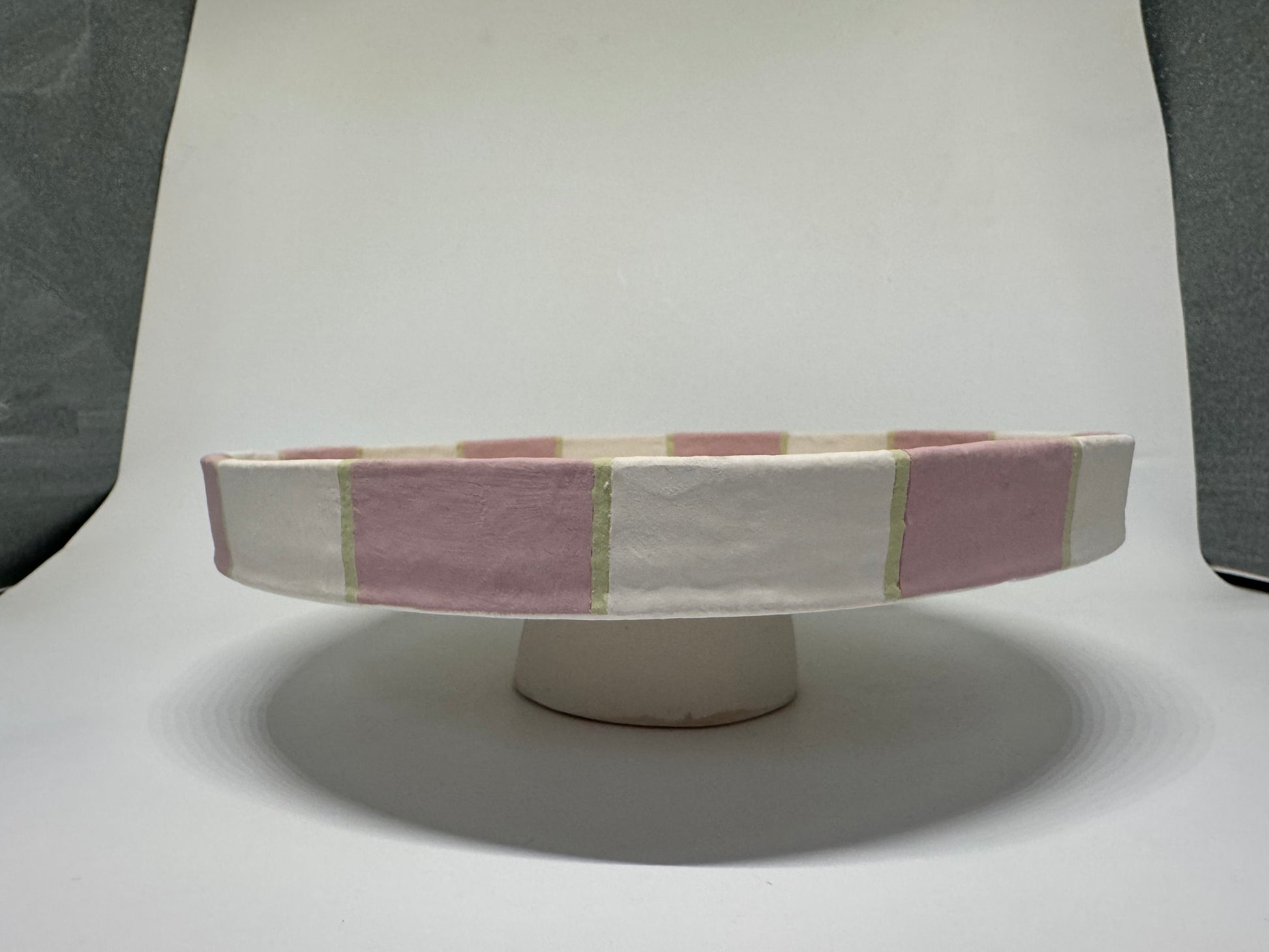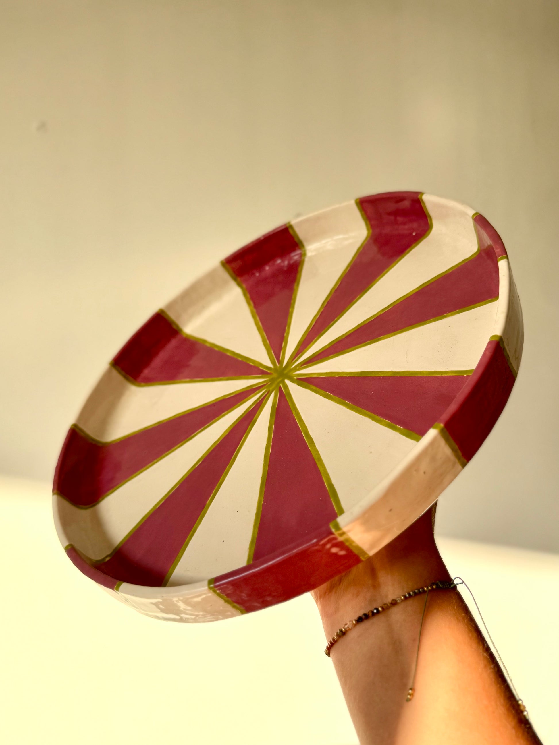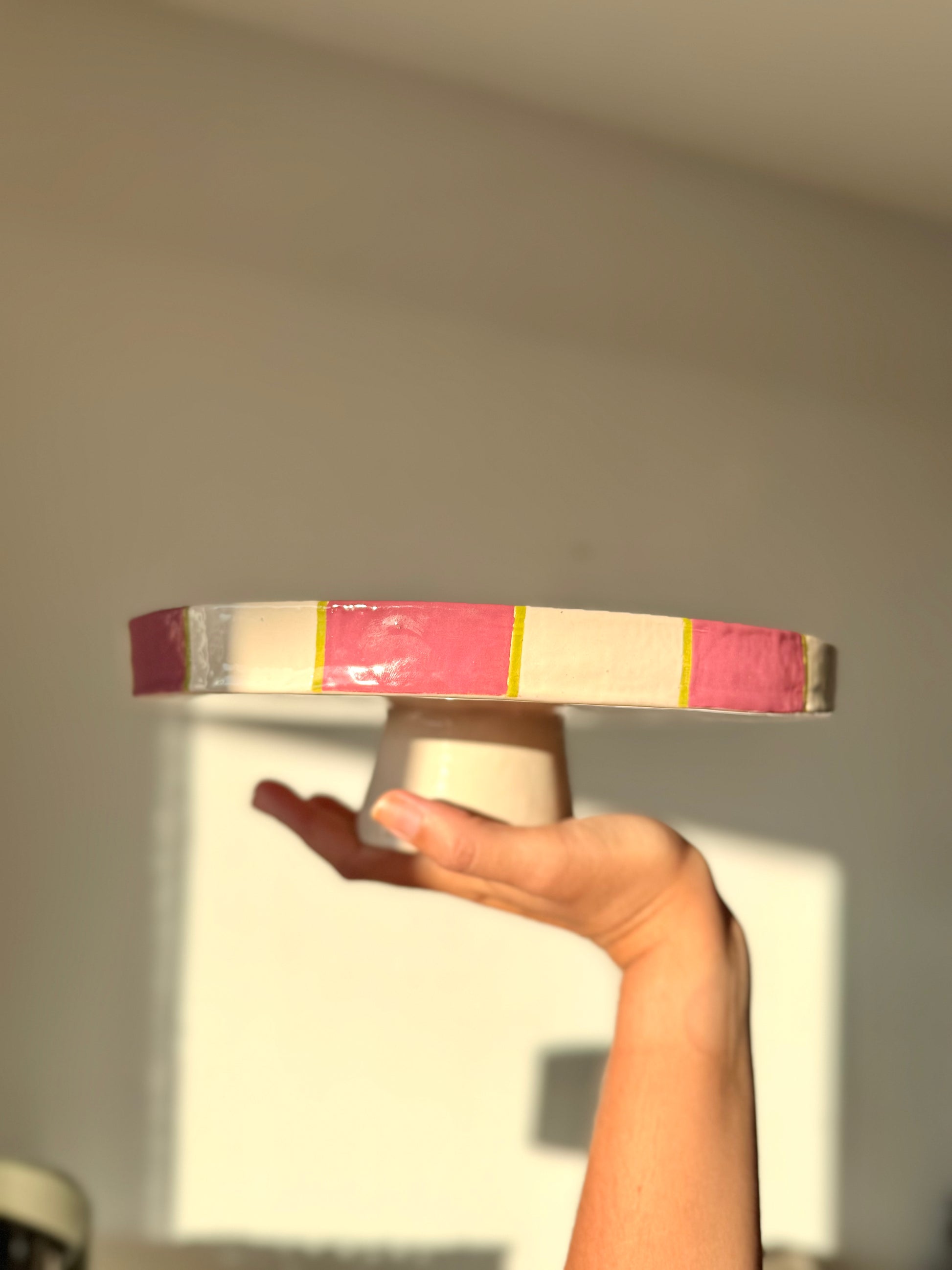 Dit unieke taartplateau is volledig met de hand opgebouwd uit klei en met zorg afgewerkt tot een echte blikvanger. Tijdens het maakproces is laag voor laag de vorm opgebouwd, waarna het plateau is geglazuurd in drie prachtige tinten die samen een vrolijk, feestelijk patroon vormen.