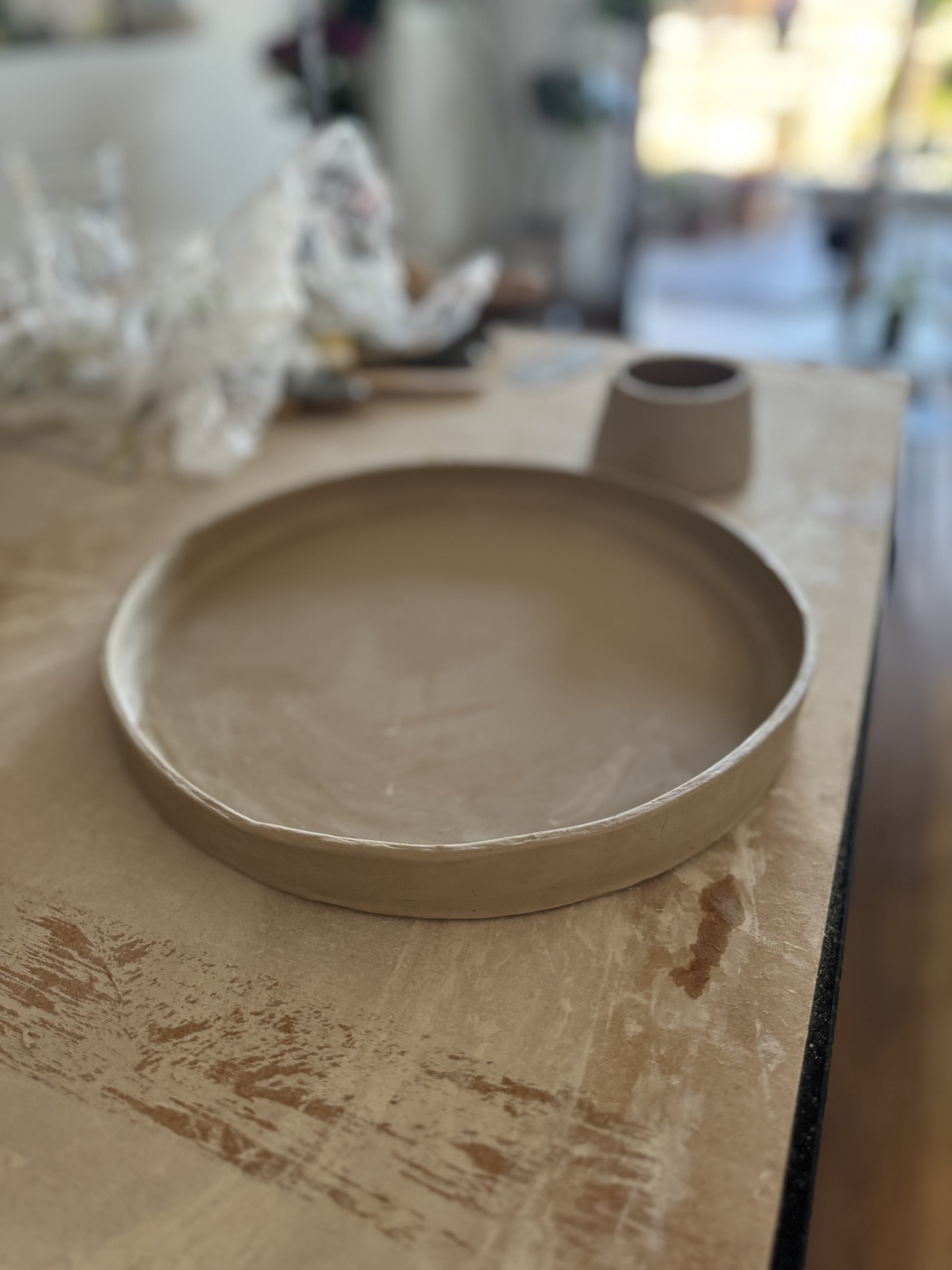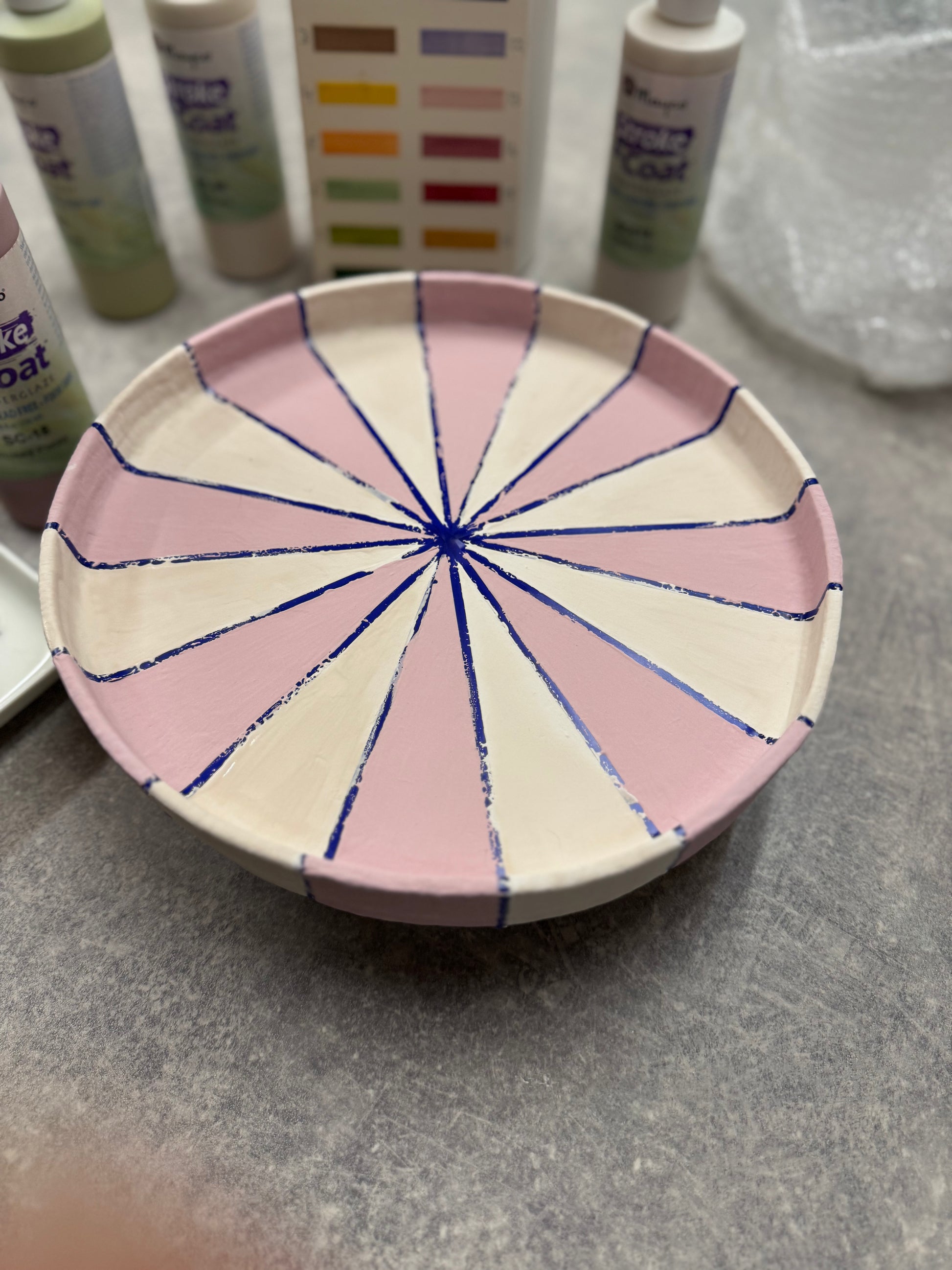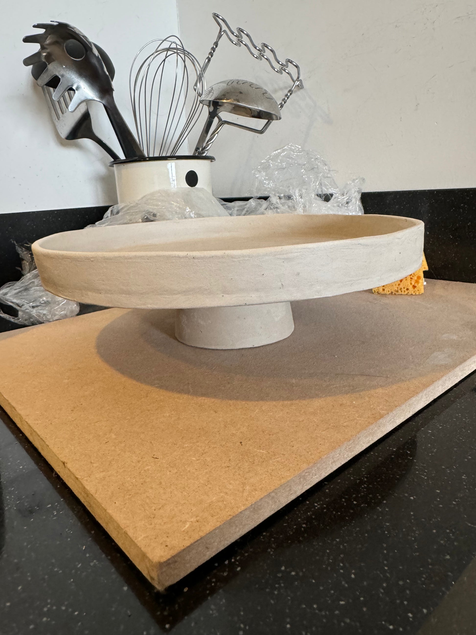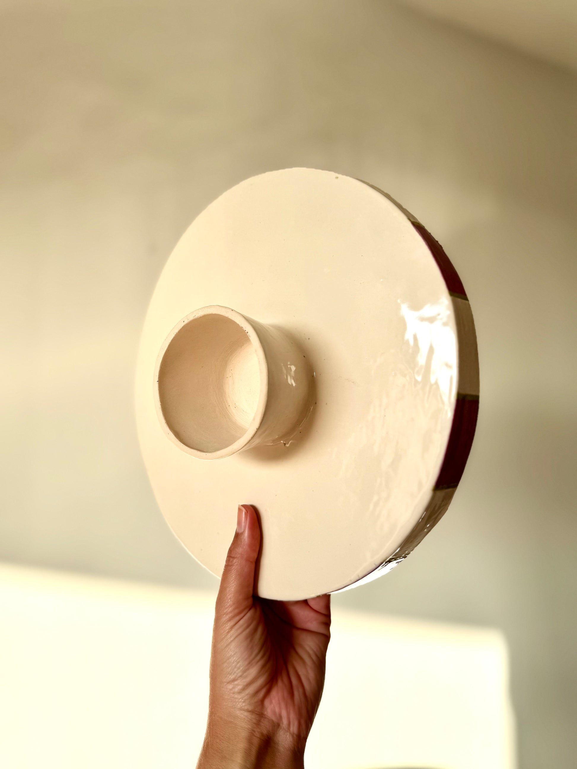 Dit unieke taartplateau is volledig met de hand opgebouwd uit klei en met zorg afgewerkt tot een echte blikvanger. Tijdens het maakproces is laag voor laag de vorm opgebouwd, waarna het plateau is geglazuurd in drie prachtige tinten die samen een vrolijk, feestelijk patroon vormen.